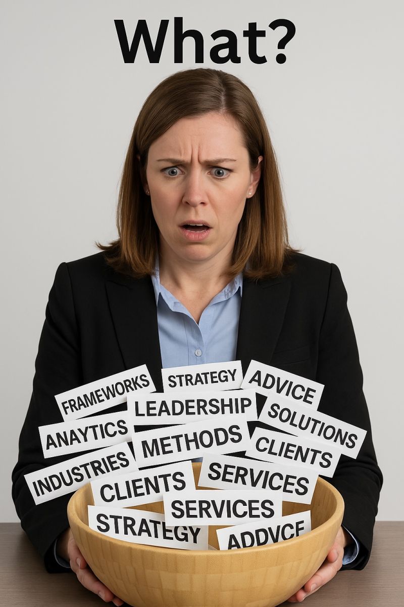When consultants try to explain what they do, it often turns into a word salad of frameworks, methodologies, industries, and capabilities.